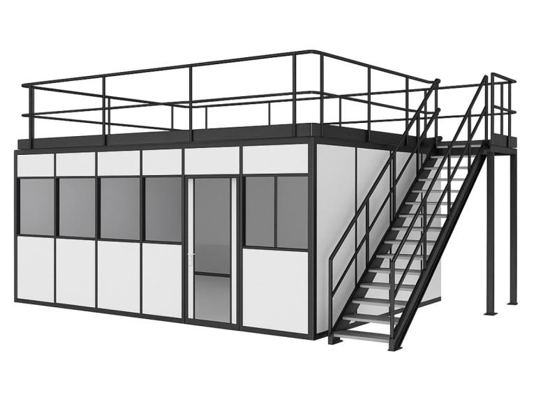 Une mezzanine de bureau est une structure métallique autoportante qui permet d’aménager un ou plusieurs bureaux en hauteur, dans un espace jusque-là inutilisé. Elle repose sur des poteaux porteurs et comprend :