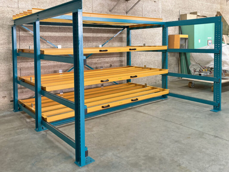 Le rack à tiroirs est un rayonnage industriel équipé de tiroirs coulissants montés sur rails, conçu pour le rangement et le stockage à plat de matériaux lourds, encombrants ou fragiles. Il permet de stocker des charges de grande taille (stockage de panneaux bois ou composites, plaques de plastique, objets fragiles et lourds, gabarits, moules ou outils industriels) de façon structurée, sans empilement.